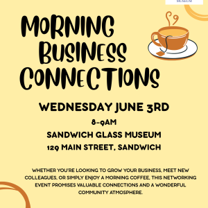 Morning Business Connections – The Sandwich Glass Museum Join us for morning coffee, networking and meeting new colleagues! 03 Jun 8:00 am - 9:00 am